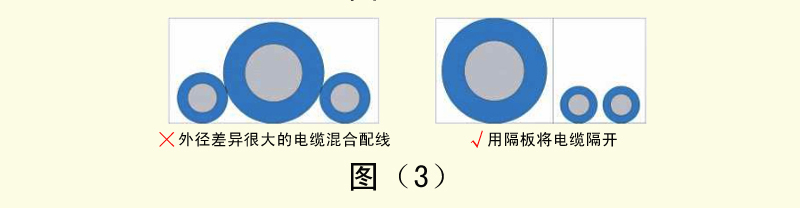 4、外徑差異很大的電纜如果混合配線,容易導致細線被粗線壓迫,造成細線容易斷線。這時需要用隔板將電纜隔開。如圖(3)KUp拖鏈電纜-聚氨酯卷筒電纜-高柔性坦克鏈電纜廠家