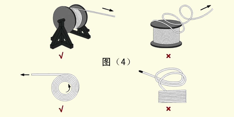 5、拖鏈電纜在敷設(shè)中不能扭曲,即不可直接從電纜卷筒或電纜盤上拉出,而應旋轉(zhuǎn)短筒或者電纜盤將電纜展開。如圖(4)KUp拖鏈電纜-聚氨酯卷筒電纜-高柔性坦克鏈電纜廠家